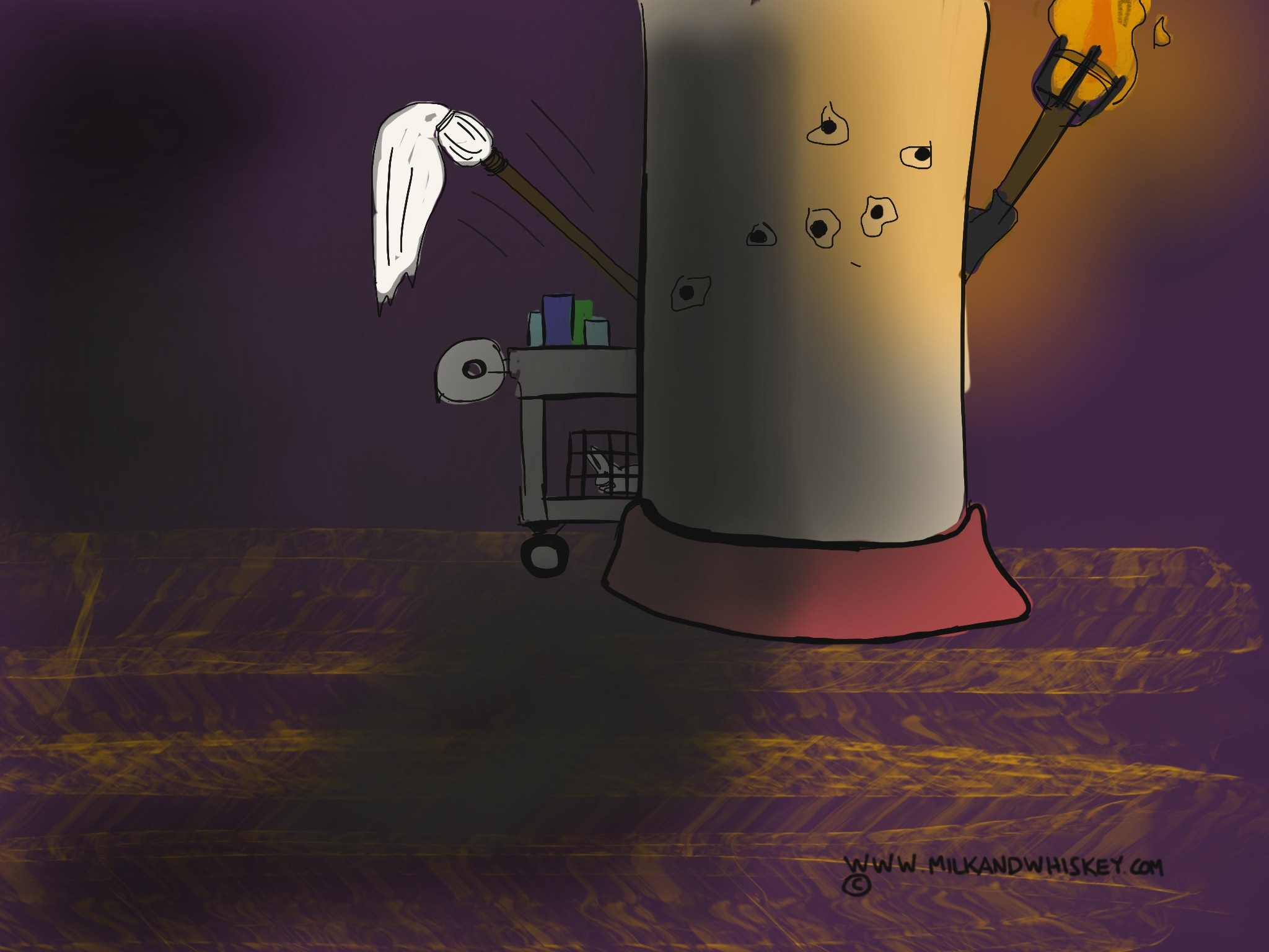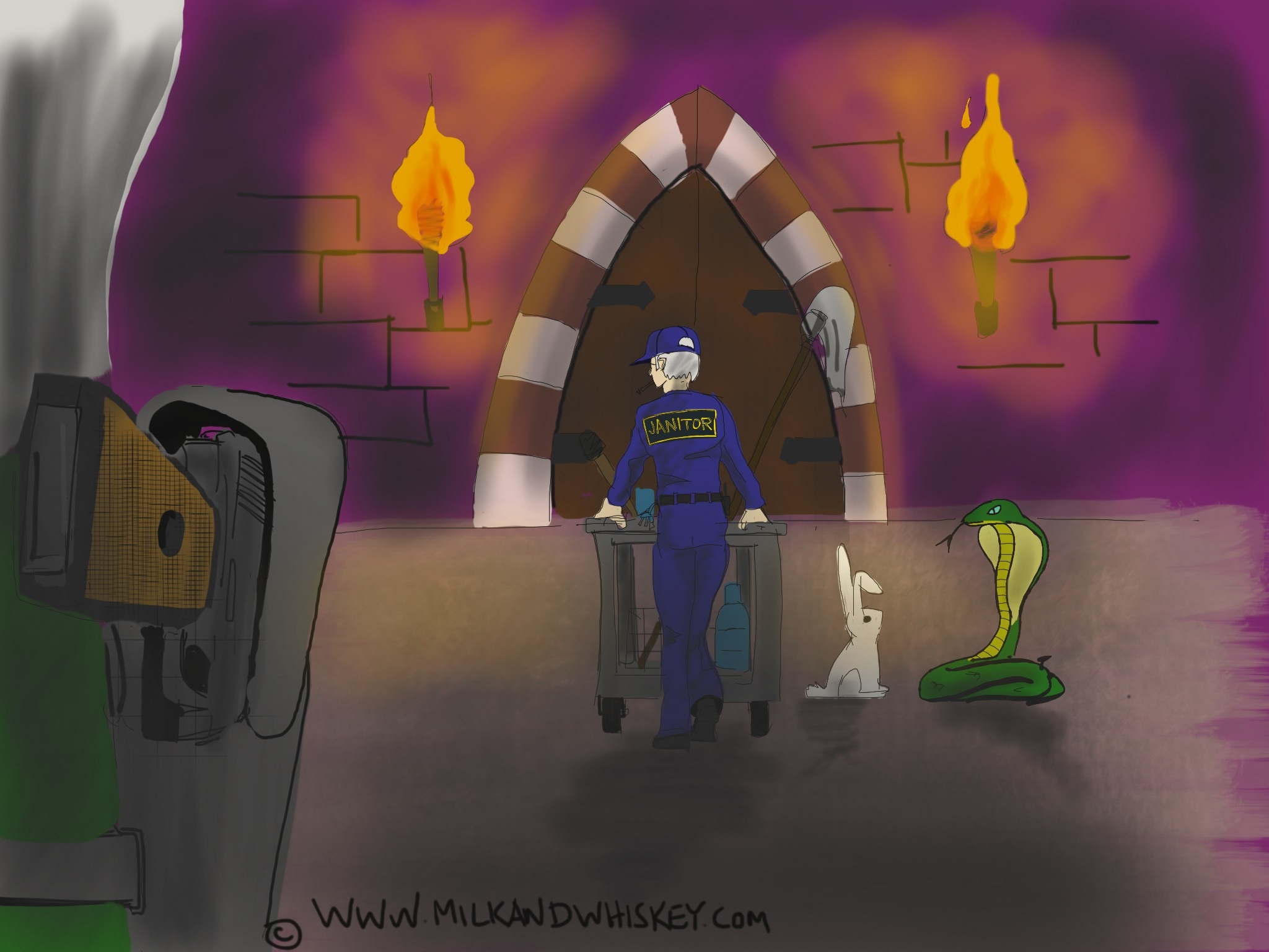 “Look lady I’m just from maintenance.” The man nervously emerges pushing a hand cart with various bottles and cleaning supplies. There is also a small wire cage with a couple of rabbits inside.