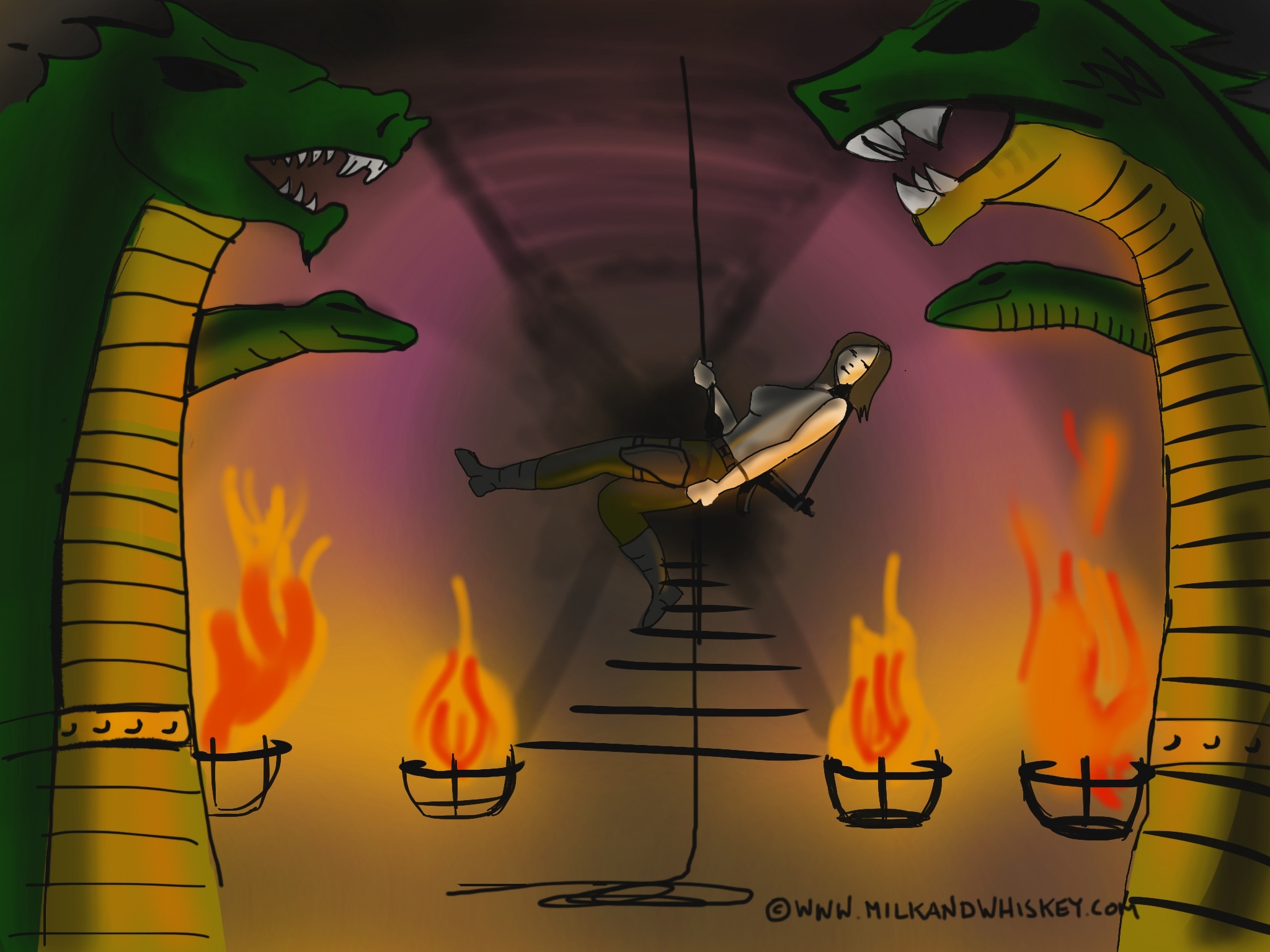 A cavernous underground temple is lit by oil braziers, the gargoyle snake gods eerily bathed in the orange glow. A hero, a beautiful woman with an athletic build marred only by perfect breasts repels into the room from the ceiling. She self arrests twenty feet from the floor, the laser sight from her HK MP5 sub machine gun traces the room as she makes sure she’s alone. Satisfied she drops to the deck making slightly more noise than a house cat.