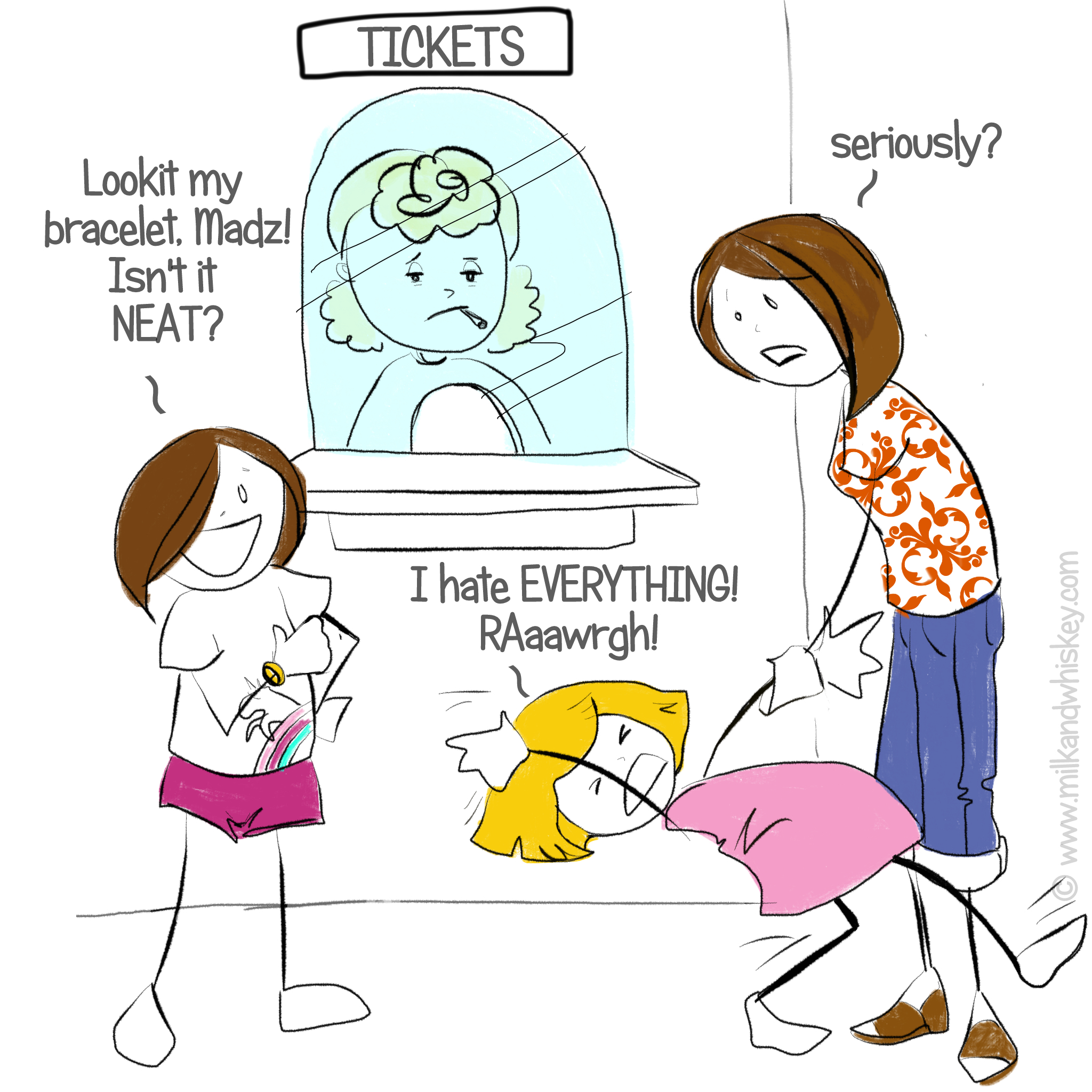 And of course the ornery cow selling the damn bracelets won’t just let ME put it on my kid because obviously this is all part of some gypsy scheme to sneak in the six extra kids I’m hiding under my skirt. So Madz not only needs to wear a non-regulation piece of paper jewelry for a few hours, she also has to stick her hand through the little space in the plexiglass window and let a strange woman TOUCH her.