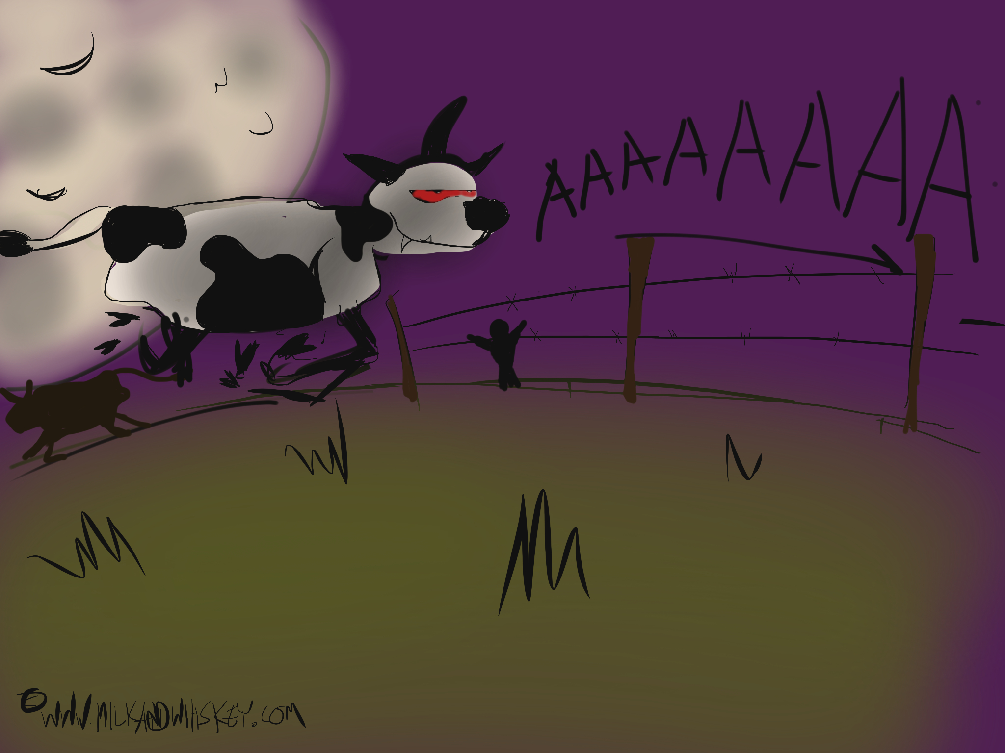 The cow woke up with the loudest “moo” ever and looked at me. There was murder in those eyes. She could smell her relatives flesh on my breath and payback is a bitch. The rest of the herd woke instantly and I realized the moo was a cow war cry.