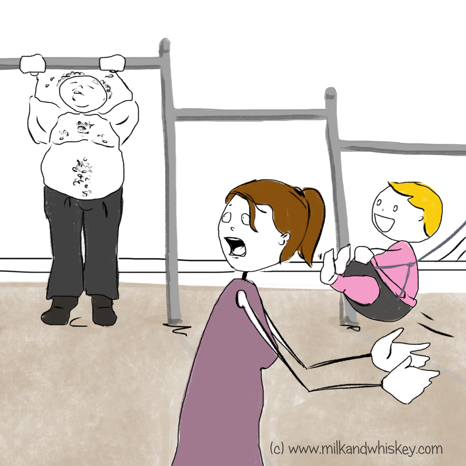 I take the Madness out and plop her in the swing. She squeals with delight. I’m aglow. I’m taking pictures. I’m keeping one eye on topless guy in case he decides to remove any other clothing. Because I’m an idiot, I kind of thought he would pick up on the whole awkward vibe of having a mom & baby team show up. I figured he’d get embarrassed and shuffle away. That is not what happened.