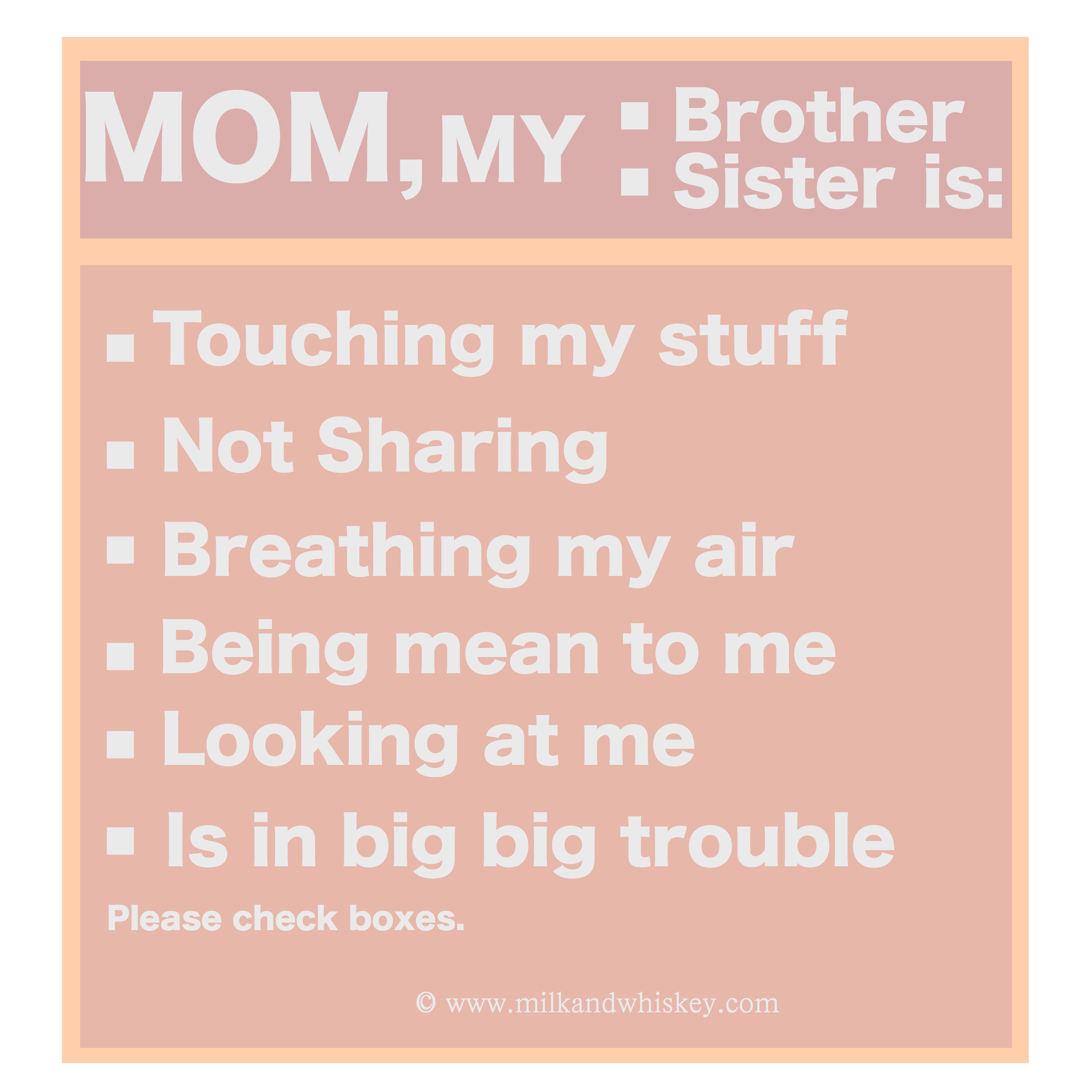 Whining, Streamlined. By Whiskey September 2, 2013 children comic humor kids Parenting siblings whining Available in a convenient tear away sticky pad. I was trying to streamline the complaining process for small children. This way I don’t have to listen to a bunch of unintelligible gibberish and we can just cut to the chase. Share this: Click to share on X (Opens in new window) X Click to share on Facebook (Opens in new window) Facebook Click to share on Reddit (Opens in new window) Reddit More Click to share on LinkedIn (Opens in new window) LinkedIn Click to share on Pinterest (Opens in new window) Pinterest Click to share on Tumblr (Opens in new window) Tumblr Click to email a link to a friend (Opens in new window) Email Like Loading... Related