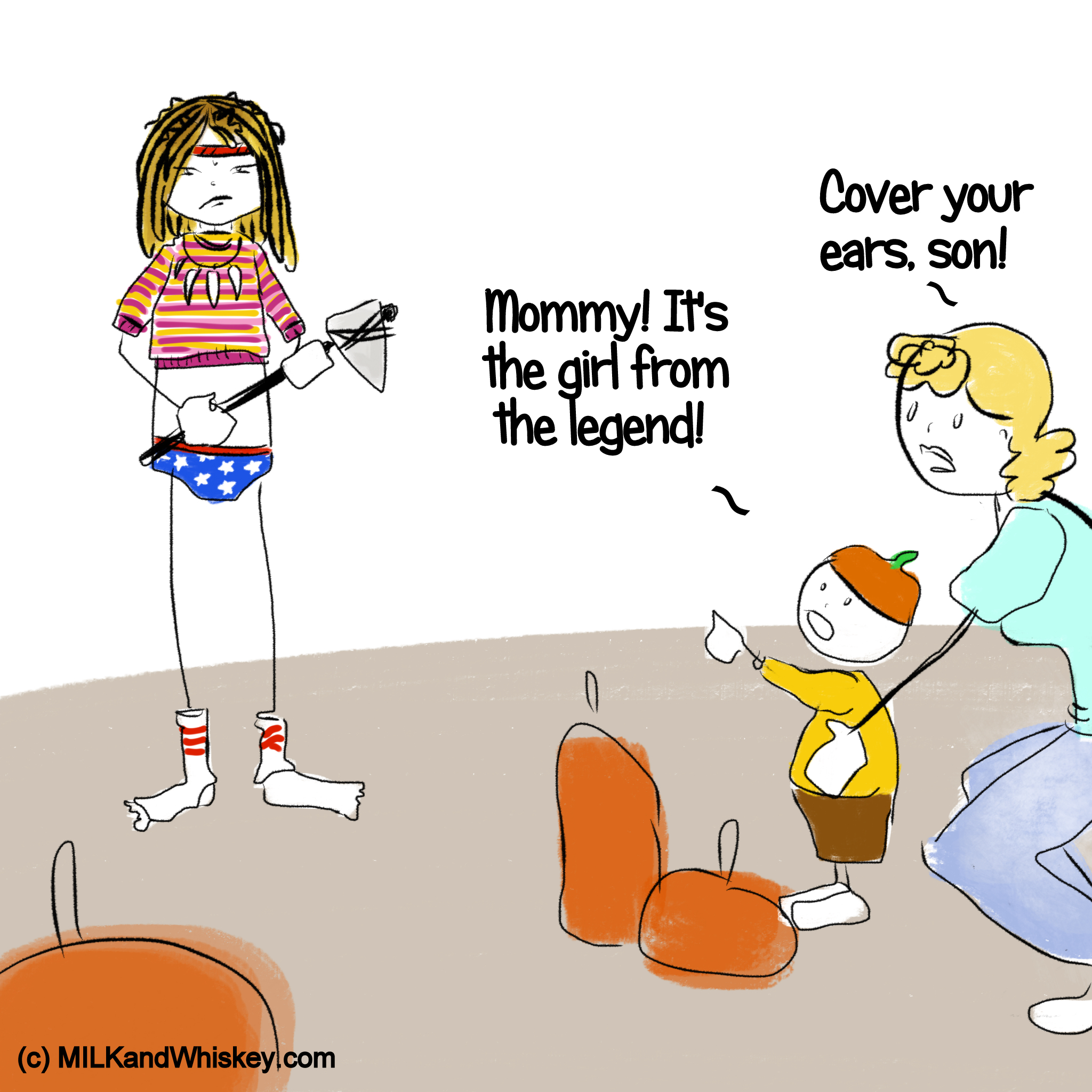 Had MILK gotten loose, I have no doubt she would have left us for dead and booked it straight into the surrounding woods. It was clear enough that her so-called mom wasn’t able to protect her from the horror risen from the patch. That woman didn’t even have enough sense to run for her life. She would just have to fend for herself in the mountains. I like to think, a few years down the line, an older, harder little girl would have wandered back into the pumpkin patch, still wearing those WonderWoman underoos, ready to exact her revenge.