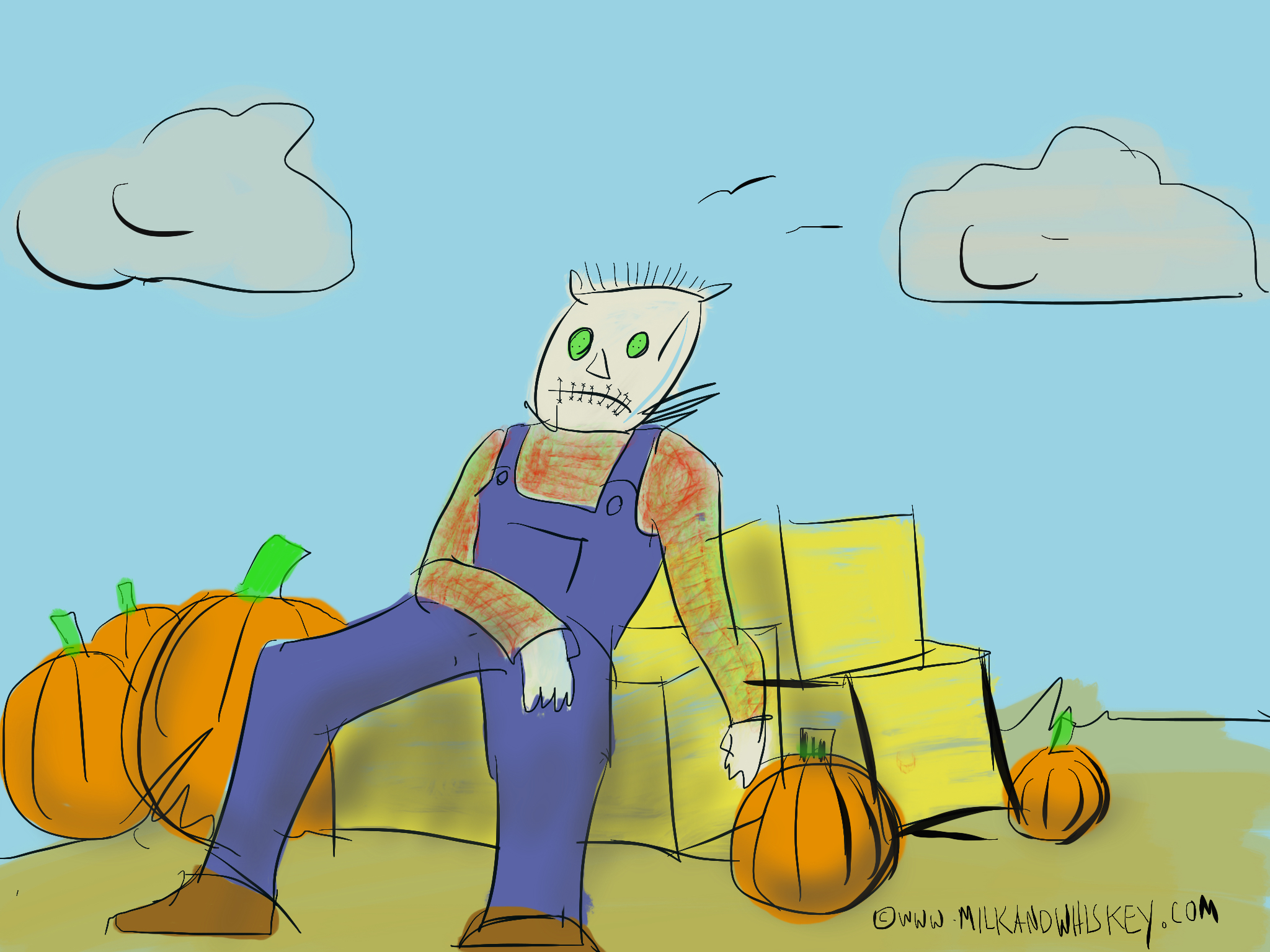 On the way home we stopped at a pumpkin patch to pick out our jack-o-lanterns for Halloween. MILK and I scampered about with our adorably terrible early-80’s home haircuts and clothes. As we worked through the pumpkin patch, hefting and rejecting squash, we got ever closer to a large scarecrow that was slumped against some hay bales.