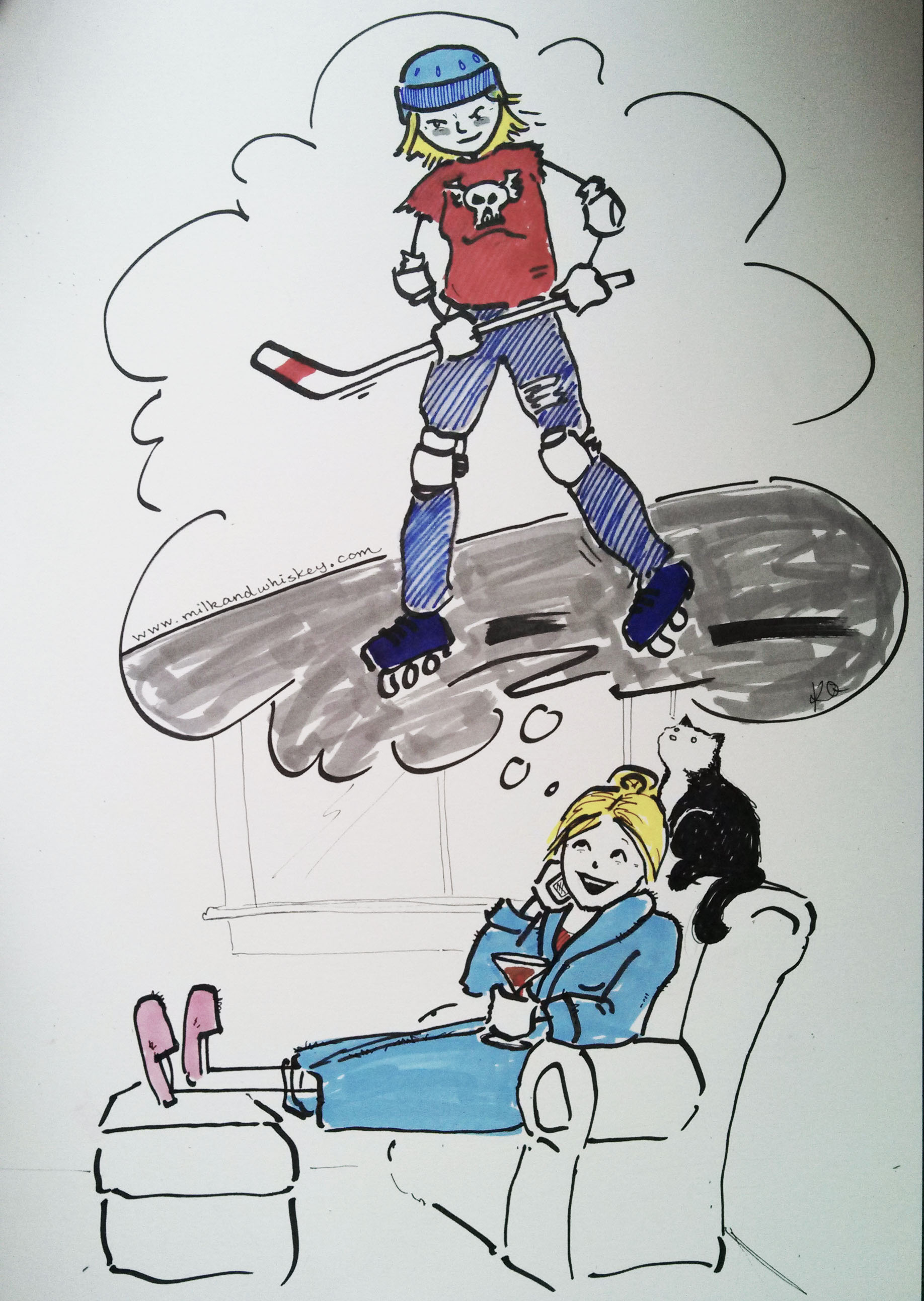 I helped her off with her skates and on with her sneakers. I doted and tended and all that. I hardly mocked her at all (though I was saving up some serious mockery for later). I was a model daughter.