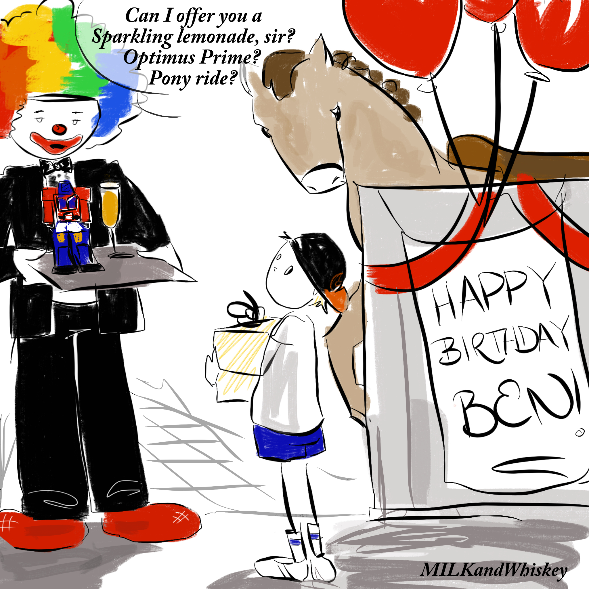 For a few years there, it was just a group of friends in the backyard with balloons and a cake that was half-cowboy, half- ballerina. Then mom switched us to the really nice day care and I became best friends with a kid named Ben. Ben had a summer birthday and rich, still-married parents, so his birthday parties were mind-blowing. It usually involved his parents taking everybody to Great America Amusement Park or Marine World Africa USA. The party favors one year were full sized Transformers. In our house, Optimus Prime would be the big gift for the lucky boy, not a frigging party favor!