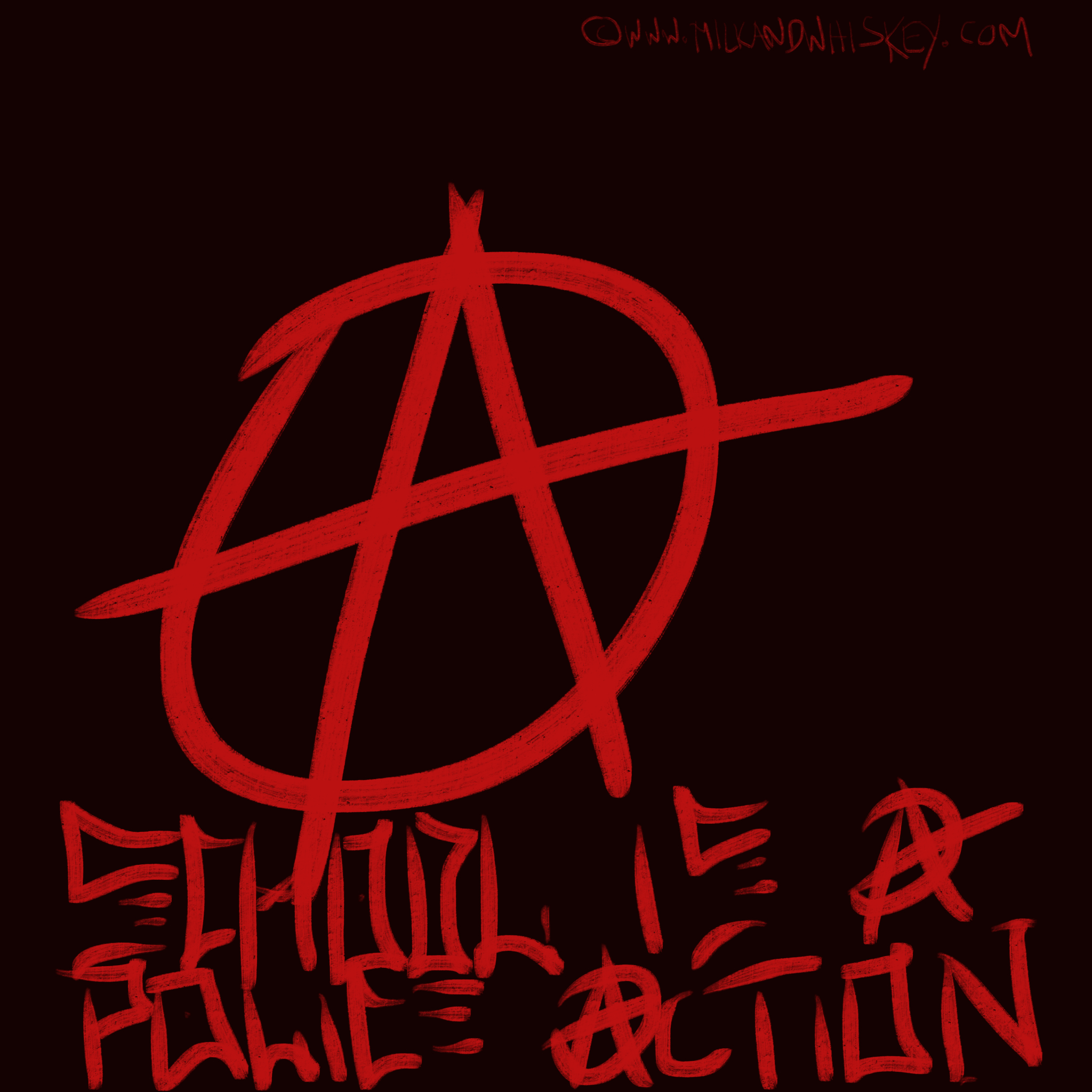 On my binder I had the anarchy symbol, a circle with an A through it and “school is a police action” written underneath it. This was a phrase I picked up from some shitty punk band and, as every misfit teenager knows, the anarchy symbol is awesome because cops and authority figures hate it, and it’s easy to draw. Never mind that anarchism is actually a political philosophy that some people take seriously enough to fight and die for.