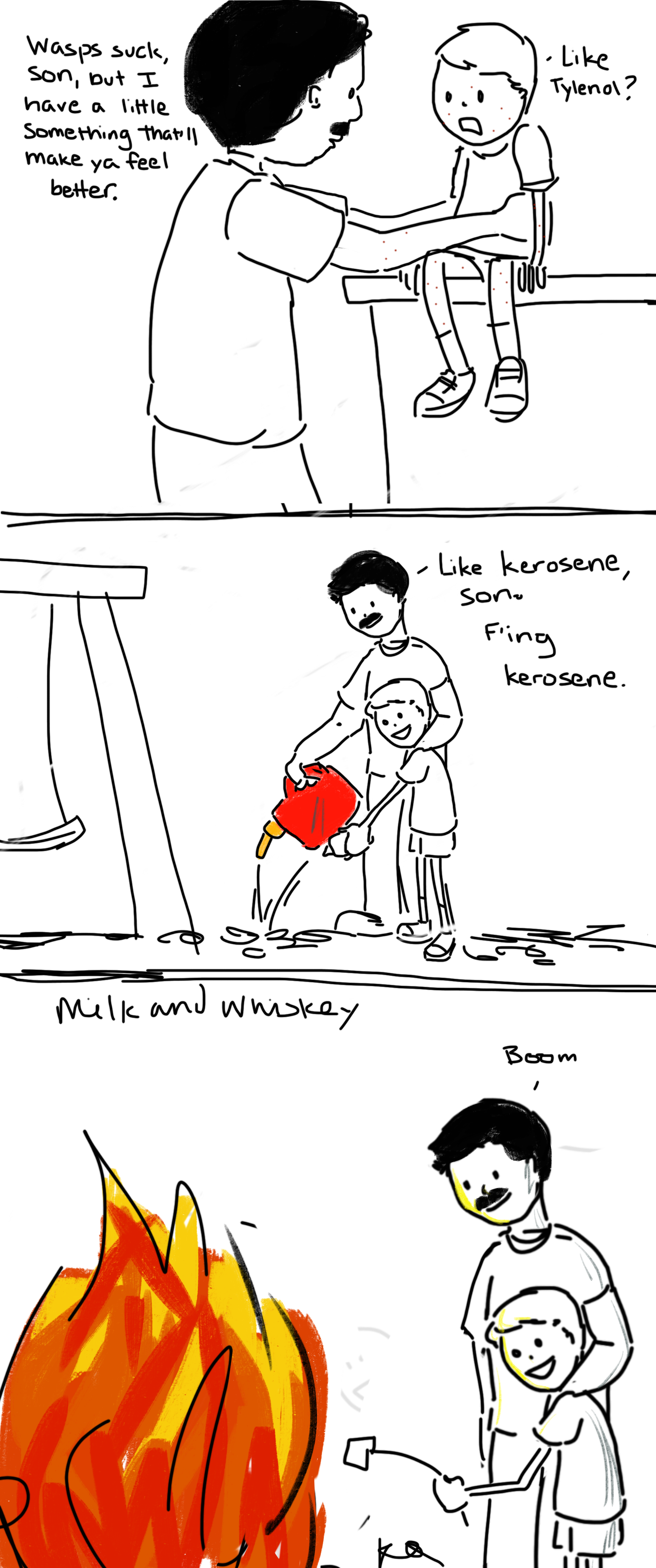 I’m still coming unglued in full seizure form and, after taking a few seconds to decipher my wails, dad rips off my pants and swats the dozen remaining North American Trouser Wasps. Thankfully, because it was the very early 80’s, I was wearing tight enough pants that none of the wasps made it far enough up my jeans to sting my tender bits. I think he gave me an Orange Creamsicle from his private stash in the way back of the freezer to make me feel better. And Tylenol. And Benadryl. And a little bourbon. Maybe the last bit was for him.