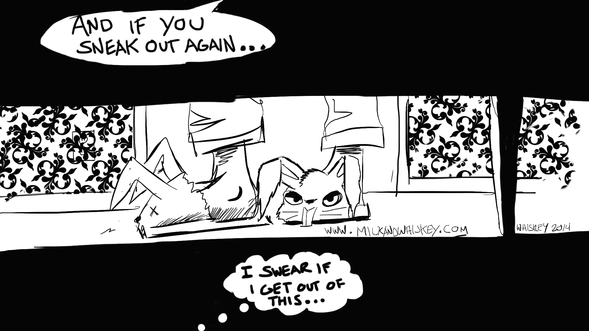 She came back to her room, but her parents kept randomly checking on her…weird I know, where’s the trust? So I spent most of the night freezing on the floor cramping up, pinned between her bed and my only viable escape route listening to her ramble on about god only knows. Around three in the morning she let me lean out her window to have a cigarette, but three minutes later I was back in my hiding place while her mom yelled at her about smelling her smoking. So I spent the entire night awake on the cold floor half under this lunatic’s bed, trying to remember how I ended up there. Something about boobs.