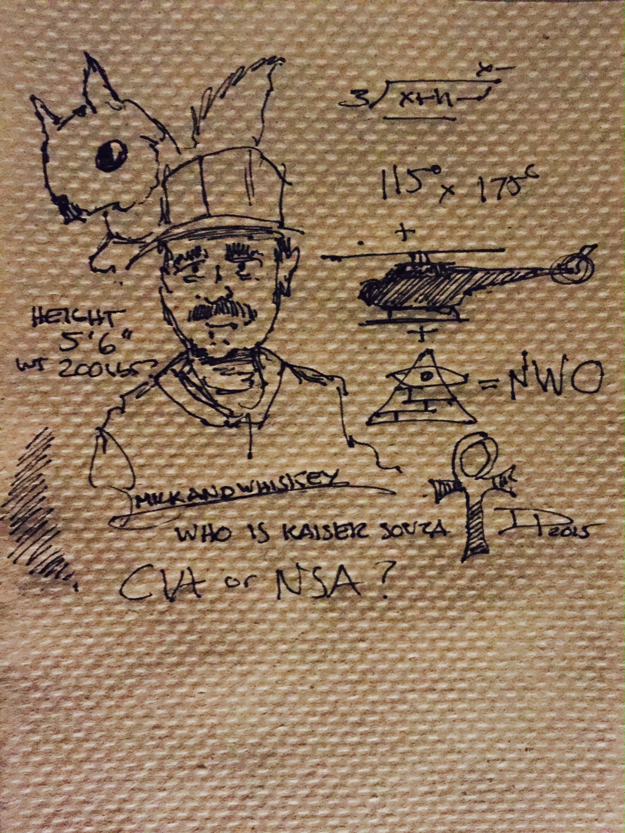 The weirdo talking about black helicopters brought me back from my happy spot and I just stared at him. He continued on his rant, and I took a pen out and briefly sketched him on a bar napkin, then I started making weird notes on it. He looked at me, suddenly wondering if he’d been talking to the wrong person about this stuff. I carefully folded up the napkin.