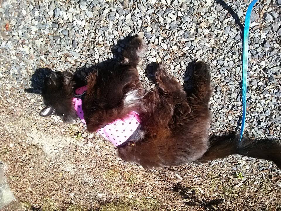 This is the cat. On her leash.