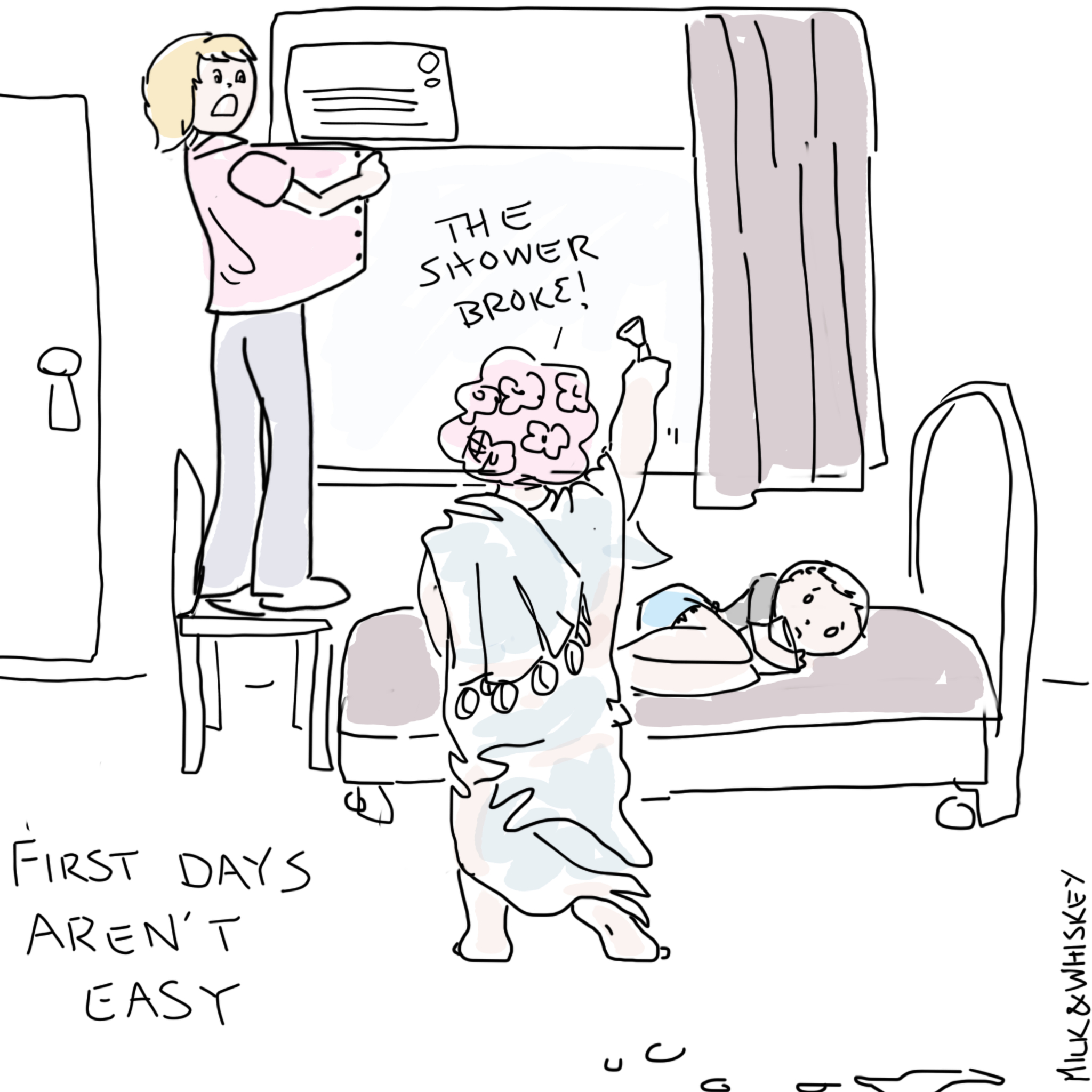 Approximately 30 seconds later there’s a tremendous crash. Grams staggers out of the bathroom wrapped in a clear shower curtain and holding a chrome knob above her head. “The hot water’s broken!” she announces, blue eyes wide. “And water is just POURING out! I can’t stop it!”