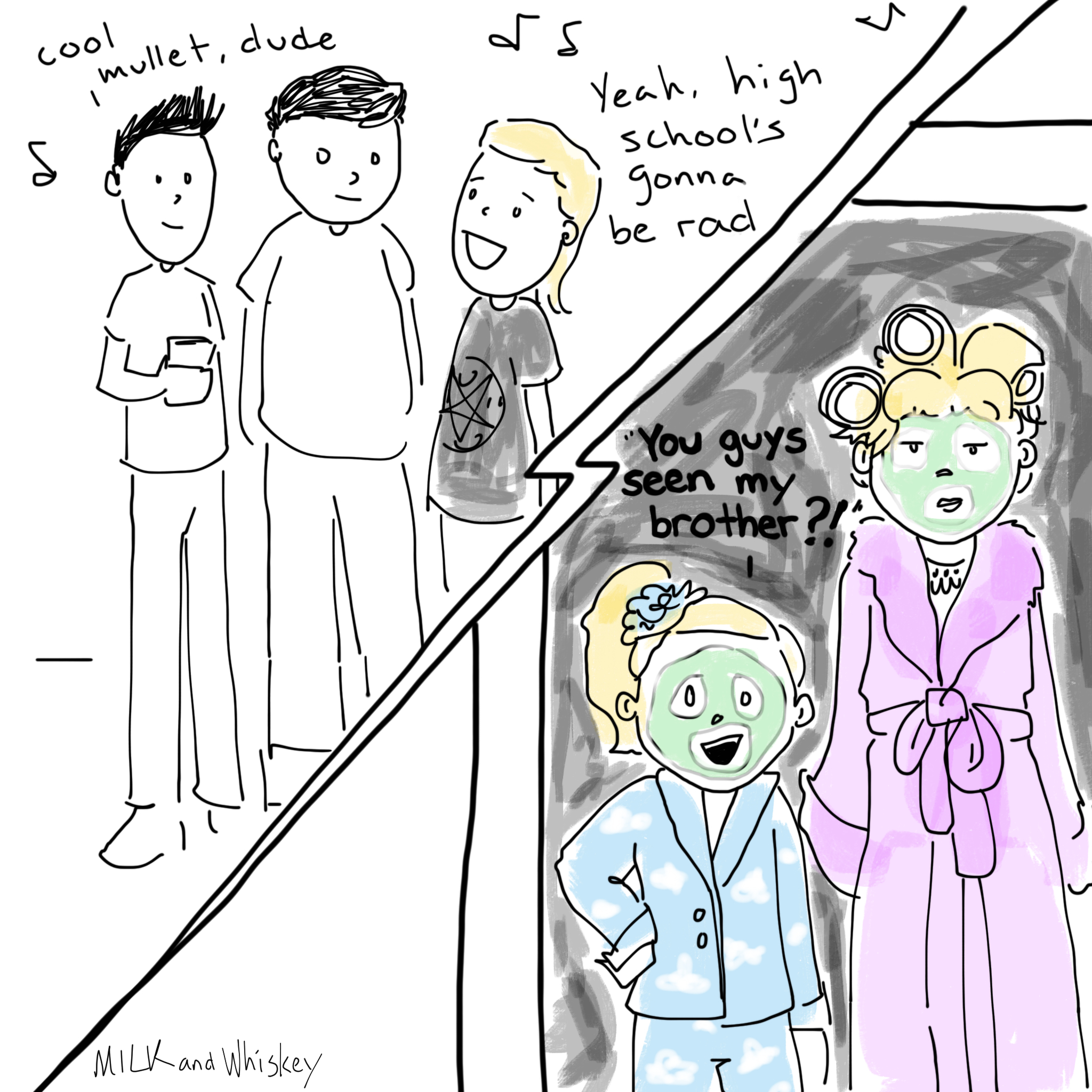 Which brings me to psychological torture, and also that great and terrible beast known as middle school. Whiskey was in eighth grade. You can’t spank an eighth grader. The ONE TIME my brother got invited to a party and stayed just a little too late, mom decided to go and fetch him. But because she’s our mother, this would be no simple snatch and grab. There was a lesson to be learned. Mom and I put on our strangest pajamas, stuck our hair in random curlers, smeared our faces with some flower scented cream, and walked the six blocks to his friend’s house to claim him. He may have been too fast to smack, but he was too slow to dodge the wrecking ball of embarrassment shuffling down Murphy Avenue in bunny slippers. He never saw it coming.